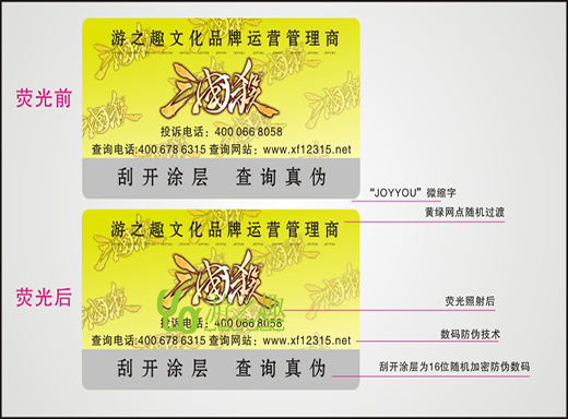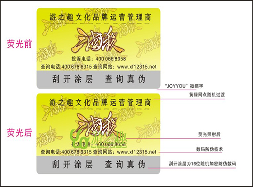 熒光防偽商標(biāo)是將熒光防偽技術(shù)應(yīng)用于普通的防偽商標(biāo)上,消費者或經(jīng)營者可通過簡單的設(shè)備鑒定其真?zhèn)?。如果在此基礎(chǔ)上,再將數(shù)碼防偽技術(shù)、版紋防偽技術(shù)應(yīng)用到相應(yīng)標(biāo)識上,又可大大提高防偽效果,也更方便消費者查詢產(chǎn)品真?zhèn)?,從而提升產(chǎn)品信譽(yù)。