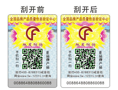 編碼印在涂層的下面,在涂層沒被刮開之前是保密的。(所有標(biāo)簽編碼都被涂層覆蓋,貼到產(chǎn)品上都是完好無損的,產(chǎn)品賣到消費(fèi)者手中后才可以被刮開查詢,在這之前是絕對保密的)